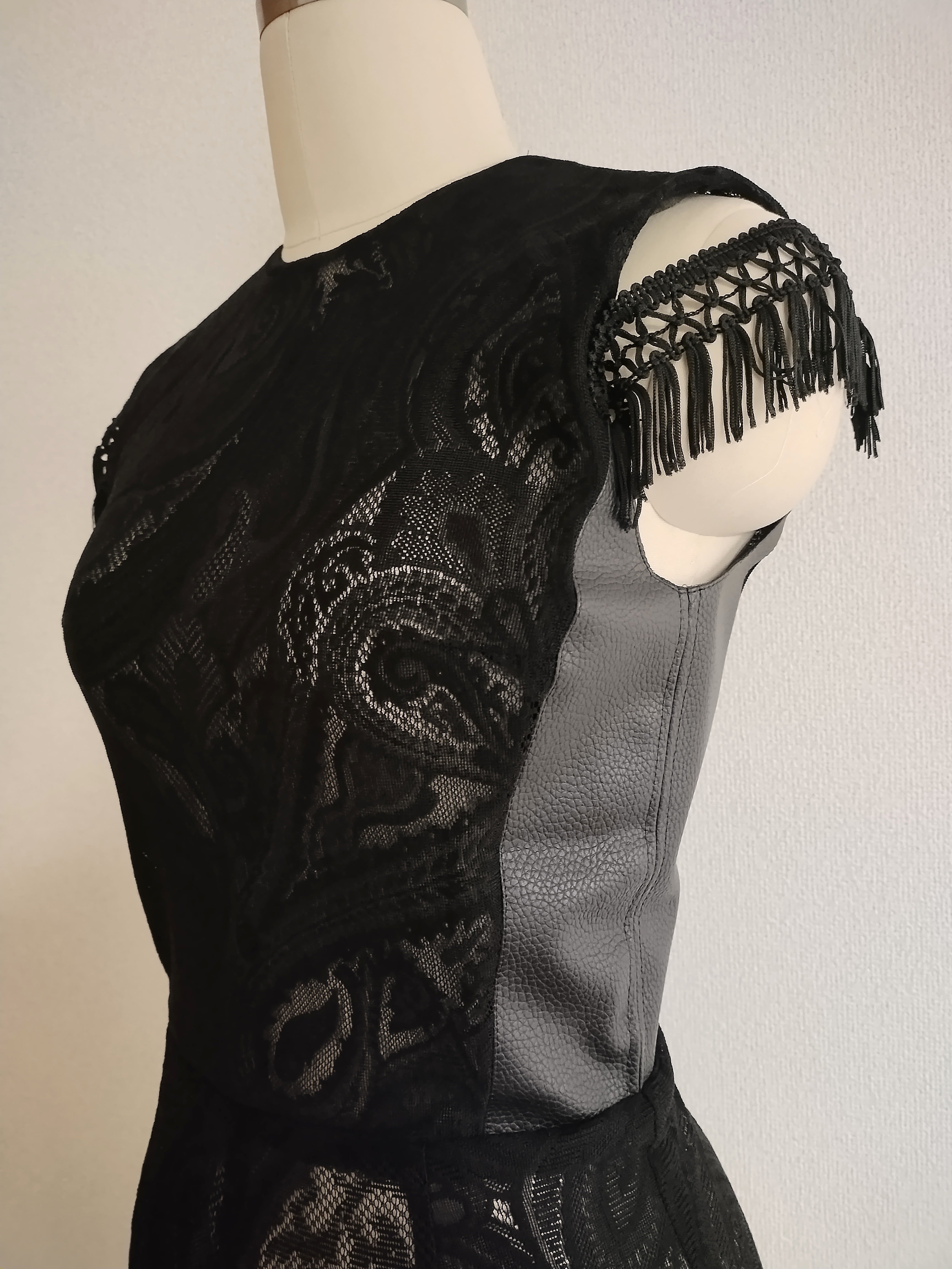華やかなスタイルを演出する《vivezlacroy》のMD-151。合皮とペーズリー模様のレースを組み合わせたノースリーブロング丈ドレスで、大人の女性の魅力を存分に引き出します。