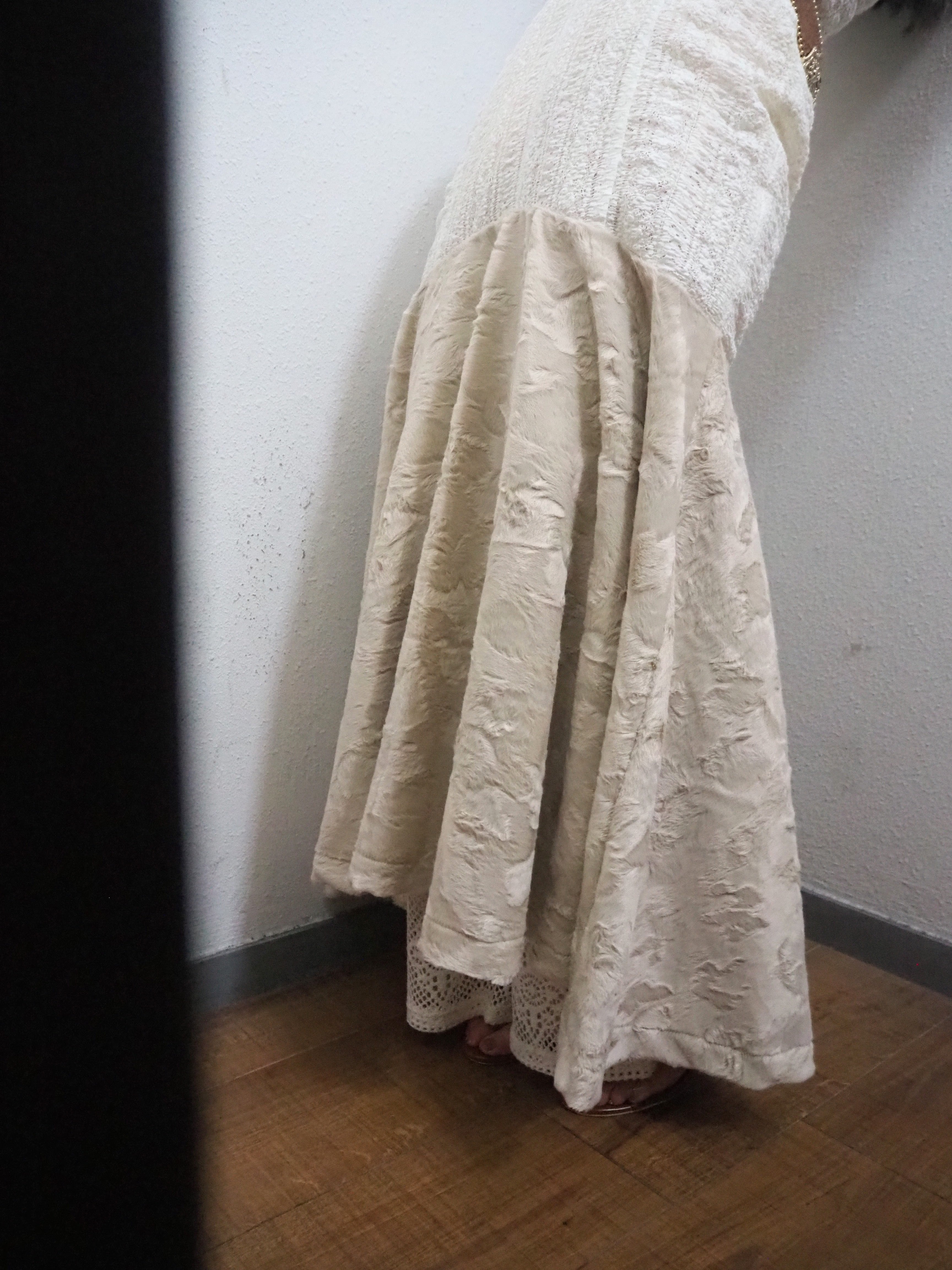 モールレースのたて模様がアクセントに。スカートはフレア分量たっぷりで動いたときのシルエットがきれいに広がります。