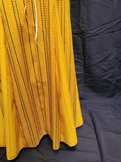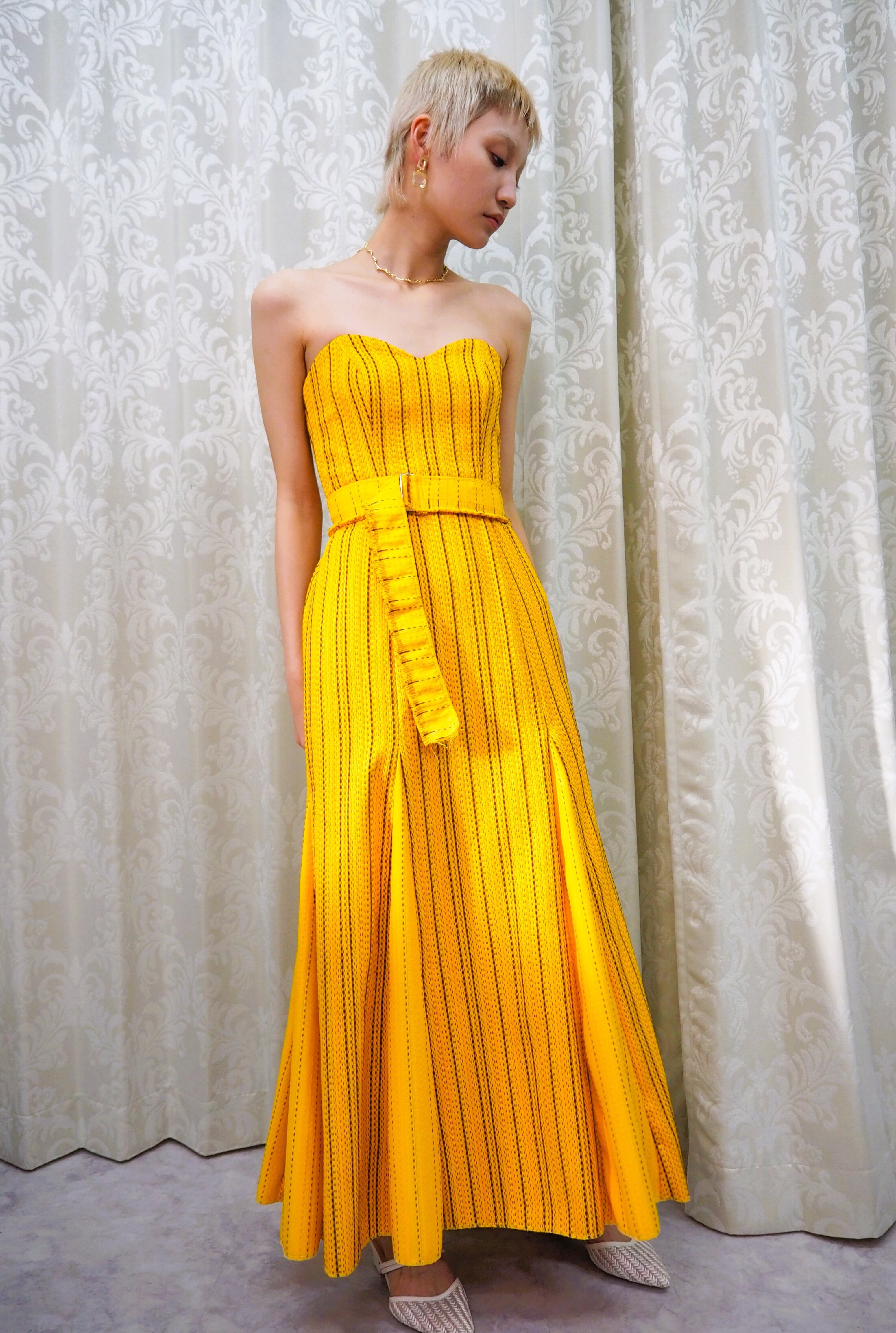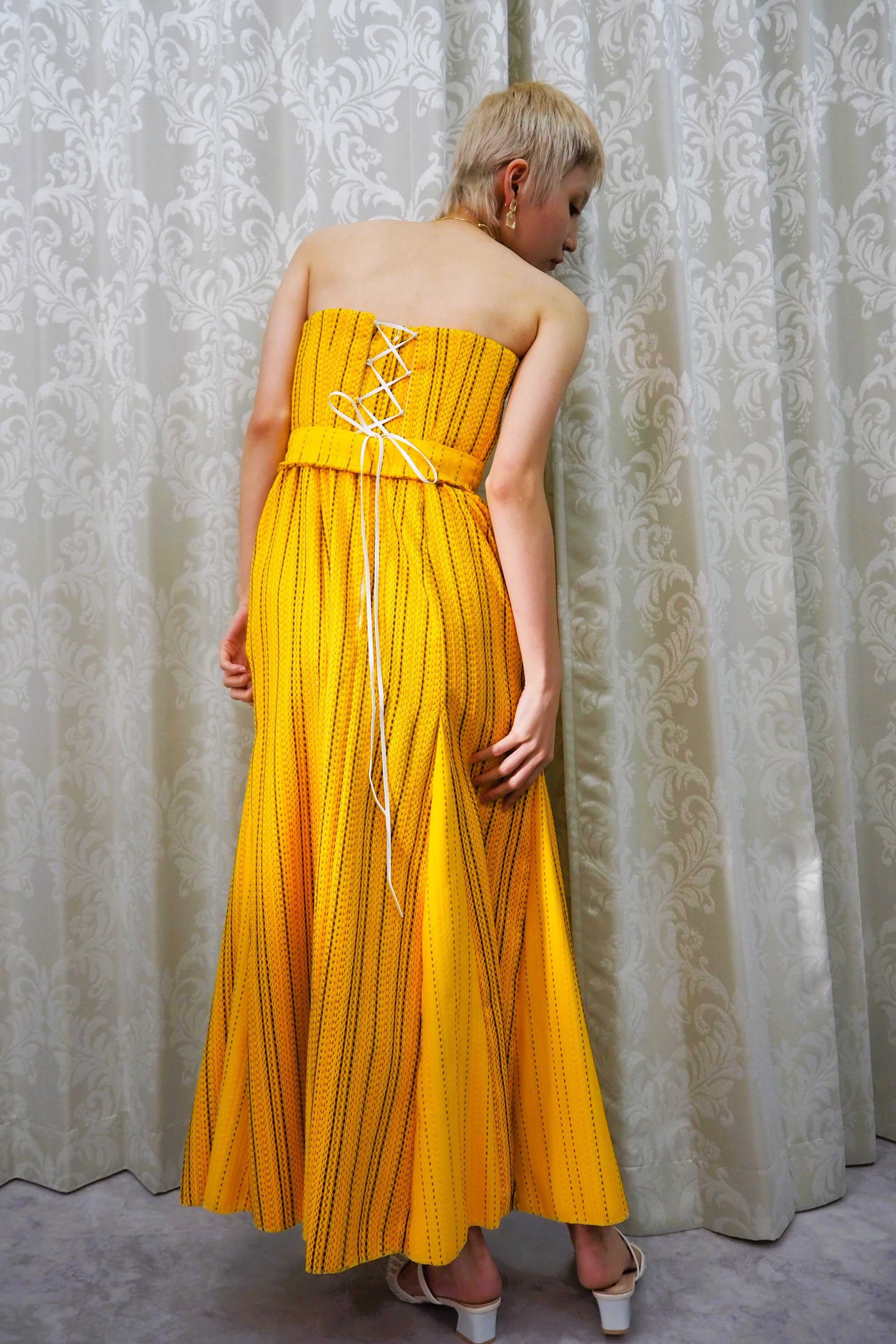 Aラインのシルエットが美しい《vivezlacroy》MD-173。イエロードビー素材で仕立てられたこのドレスは、軽やかでポップな印象が魅力です。スカートには程よいフレアボリュームがあり、マチ付きのデザインで、動きが出やすいです。